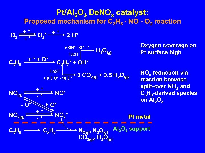 Pt/Al 2 O 3 De. NOx catalyst: Proposed mechanism for C 3 H 8 - NO - O 2 reaction +* -* O 2 * + * 2 O* + OH* - O* - * C 3 H 8 FAST + * + O* + 9. 5 O* - 10. 5 * +* -* - O* NO 2(g) C 3 H 8 NO* +* -* H 2 O(g) C 3 H 7* + OH* FAST NO(g) Oxygen coverage on Pt surface high NO 2* Cx Hy 3 CO 2(g) + 3. 5 H 2 O(g) NOx reduction via reaction between spilt-over NO 2 and C 3 H 8 -derived species on Al 2 O 3 Pt metal N 2(g), N 2 O(g) Al 2 O 3 support CO 2(g), H 2 O(g)