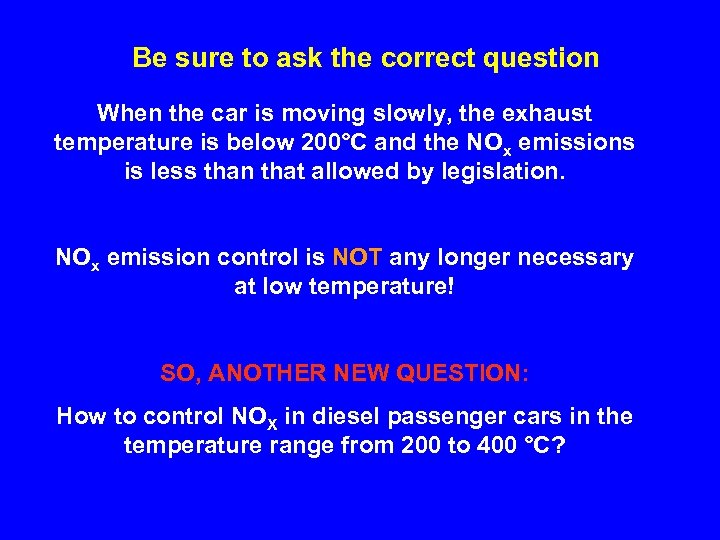 Be sure to ask the correct question When the car is moving slowly, the exhaust temperature is below 200°C and the NOx emissions is less than that allowed by legislation. NOx emission control is NOT any longer necessary at low temperature! SO, ANOTHER NEW QUESTION: How to control NOX in diesel passenger cars in the temperature range from 200 to 400 °C?