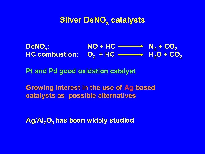 Silver De. NOx catalysts De. NOx: HC combustion: NO + HC O 2 + HC N 2 + CO 2 H 2 O + CO 2 Pt and Pd good oxidation catalyst Growing interest in the use of Ag-based catalysts as possible alternatives Ag/Al 2 O 3 has been widely studied