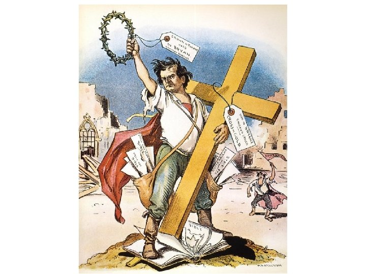 Election of 1896 William Jennings Bryan “the Great Commoner" (Democrat) • great orator (speaking skills) • defender of the farmer • supported by Democratic voters of South and West • “Cross of Gold” speech demanded free coinage of silver "You shall not crucify mankind upon a cross of gold!" • received Democratic nomination AND Populist Party nomination • revolutionized campaigning - nationwide circuit twenty to thirty speeches per day