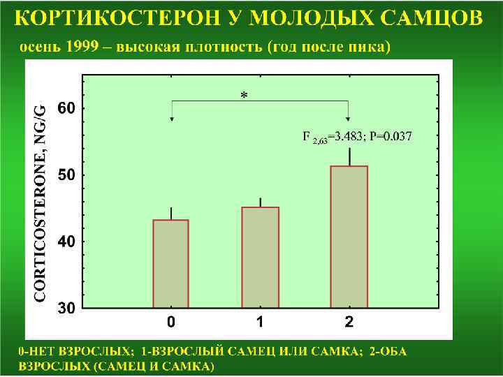 МАССА ТЕЛА МОЛОДЫХ САМЦОВ ОСЕНЬ 1999 F 2, 65=4. 457; P=0. 015 * 0 -НЕТ ВЗРОСЛЫХ; 1 -ВЗРОСЛЫЙ САМЕЦ ИЛИ САМКА; 2 -ОБА ВЗРОСЛЫХ (САМЕЦ И САМКА)
