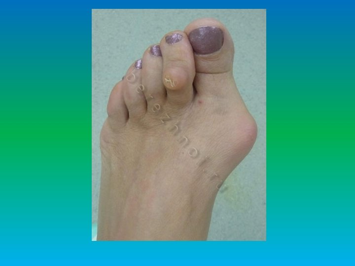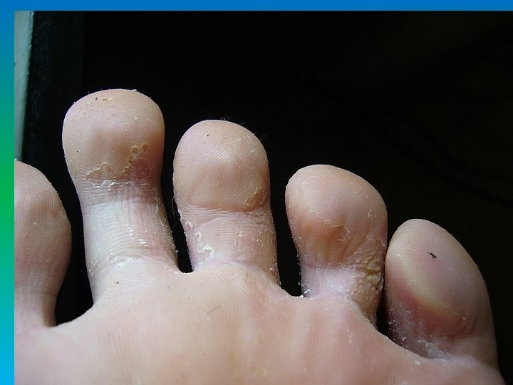 Грибковое поражение стоп: общие факторы, предрасполагающие к поражению стоп • Сосудистые заболевания конечностей(варикоз, б. Рейно) • Микротравмы, приводящие к постоянным кровоизлияниям. • Сахарный диабет • Прием глюкокортикостероидов, АБ • Перегрев или переохлаждение стоп • Деформация стопы(плоскостопие)