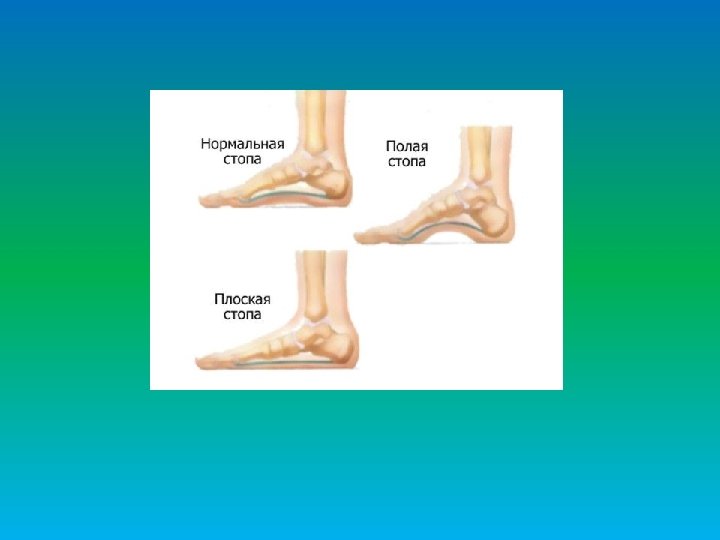 ЭТИОЛОГИЯ И ПАТОГЕНЕЗ ЗАБОЛЕВАНИЙ СТОПЫ • паралитическая - 5, 7% (вследствие перенесенного полиомиелита) • рахитическая - 3, 2% • статическая - 82, 1% (растяжение связочного аппарата и снижение тонуса мышц)