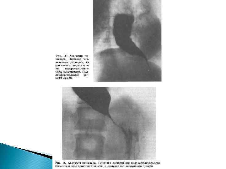 Рентгенограмма пищевода с нормальным просветом Расширение пищевода вследствие ахалазии. Внизу просматривается сужение кардиального отдела желудка, препятствующее прохождению пищи