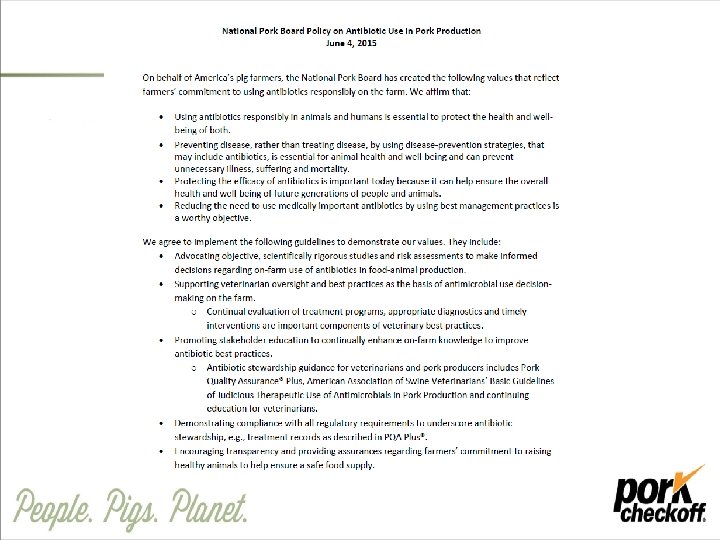 Industry Efforts • National Pork Board Antibiotics Position Statement and Policy • National Pork Board Three-Point Antibiotic Stewardship Plan • Allocate up to $1. 4 million in funding of scientific research and antibiotic risk assessment studies, producer education and consumer awareness programs