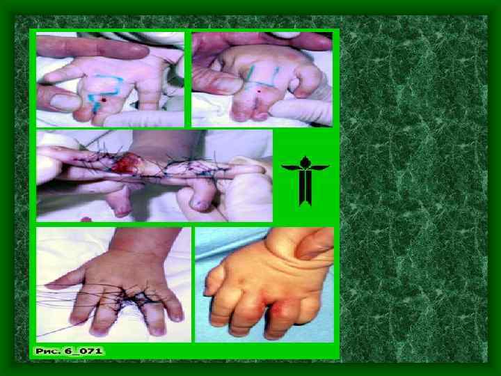 Синдактилия сращение пальцев • Независимо от вида синдактилий оперативное лечение не ранее 3 летнего возраста. Это объсняется несовершенством кровеносной системы сросшихся пальцев и во время операции можно повредить единственную артерию, питающую оба пальца. Кроме того, после операций, проведенных в раннем возрасте, формируются грубые рубцы, деформирующие сегмент в процессе роста. • Полидактилия – оперативное лечение возможно с первых месяцев жизни, особенно если это рудимент пальца.