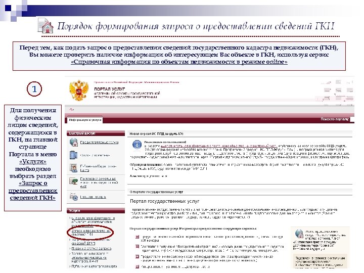 Перед тем, как подать запрос о предоставлении сведений государственного кадастра недвижимости (ГКН), Вы можете проверить наличие информации об интересующем Вас объекте в ГКН, используя сервис «Справочная информация по объектам недвижимости в режиме online» 1 Для получения физическим лицом сведений, содержащихся в ГКН, на главной странице Портала в меню «Услуги» необходимо выбрать раздел «Запрос о предоставлении сведений ГКН»