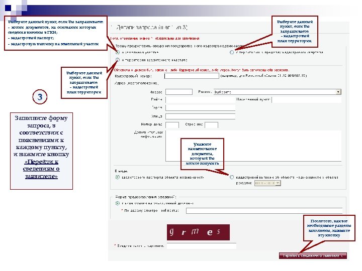 Выберите данный пункт, если Вы запрашиваете: – копии документов, на основании которых сведения внесены в ГКН; – кадастровый паспорт; – кадастровую выписку на земельный участок 3 Выберите данный пункт, если Вы запрашиваете: – кадастровый план территории Заполните форму запроса, в соответствии с пояснениями к каждому пункту, и нажмите кнопку «Перейти к сведениям о заявителе» Укажите наименование документа, который Вы хотите получить После того, как все необходимые разделы заполнены, нажмите эту кнопку