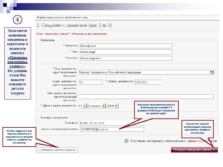 4 Заполните основные сведения о заявителе и нажмите кнопку «Проверка введенных данных» . На данном этапе Вы можете изменить детали запроса Результат выполнения запроса (электронный документ в формате PDF) будет отправлен на данный адрес Чтобы изменить или еще раз убедиться в корректности деталей запроса, нажмите на эту кнопку После того, как все необходимые разделы заполнены, нажмите эту кнопку