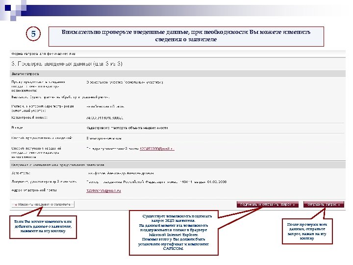 5 Внимательно проверьте введенные данные, при необходимости Вы можете изменить сведения о заявителе Если Вы хотите изменить или добавить данные о заявителе, нажмите на эту кнопку Существует возможность подписать запрос ЭЦП заявителя. На данный момент эта возможность поддерживается только в браузере Microsoft Internet Explorer. Помимо этого у Вас должен быть установлен сертификат и компонент CAPICOM. После проверки всех данных, отправьте запрос, нажав на эту кнопку
