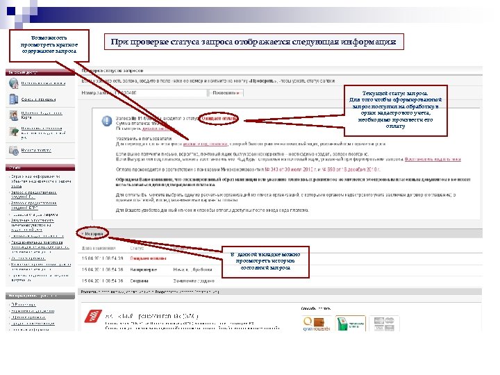 Возможность просмотреть краткое содержание запроса При проверке статуса запроса отображается следующая информация: Текущий статус запроса. Для того чтобы сформированный запрос поступил на обработку в орган кадастрового учета, необходимо произвести его оплату В данной вкладке можно просмотреть историю состояний запроса