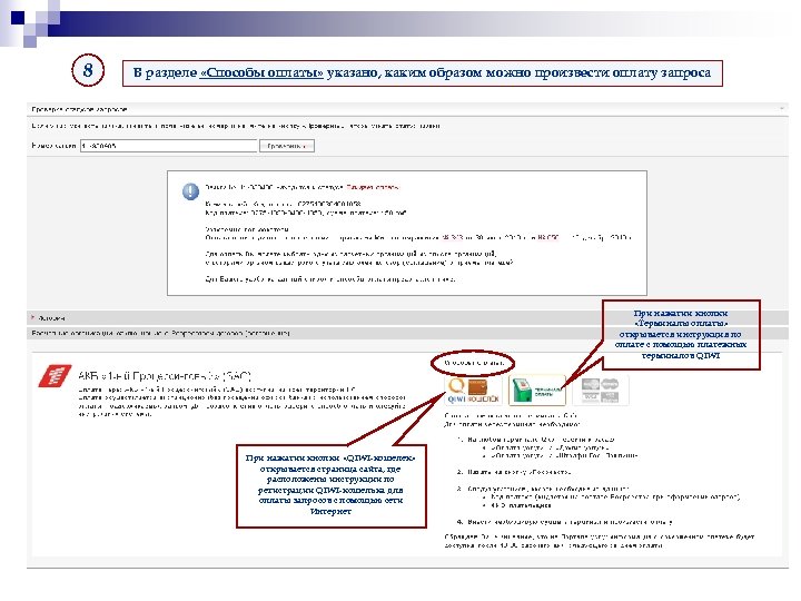 8 В разделе «Способы оплаты» указано, каким образом можно произвести оплату запроса При нажатии кнопки «Терминалы оплаты» открывается инструкция по оплате с помощью платежных терминалов QIWI При нажатии кнопки «QIWI-кошелек» открывается страница сайта, где расположены инструкции по регистрации QIWI-кошелька для оплаты запросов с помощью сети Интернет