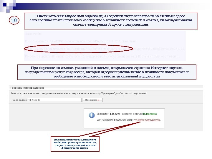 10 После того, как запрос был обработан, а сведения подготовлены, на указанный адрес электронной почты приходит сообщение о готовности сведений и ссылка, по которой можно скачать электронный архив с документами При переходе по ссылке, указанной в письме, открывается страница Интернет-портала государственных услуг Росреестра, которая содержит уведомление о готовности документов и сообщение о необходимости ввести уникальный код доступа Для получения готовых документов необходимо указать уникальный код доступа, сгенерированный на этапе формирования запроса