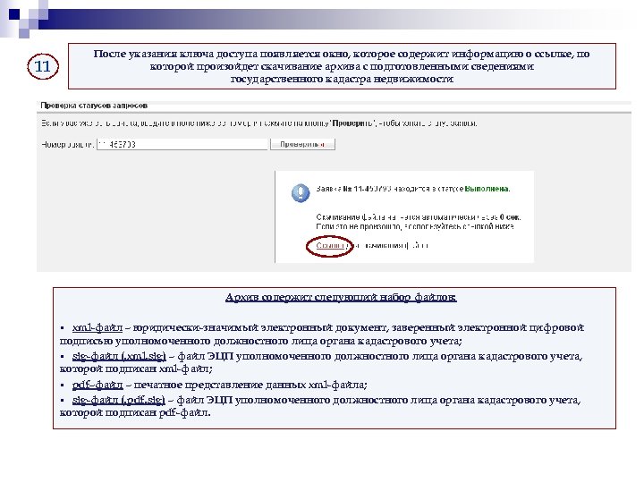 После указания ключа доступа появляется окно, которое содержит информацию о ссылке, по которой произойдет скачивание архива с подготовленными сведениями государственного кадастра недвижимости 11 Архив содержит следующий набор файлов: xml-файл – юридически-значимый электронный документ, заверенный электронной цифровой подписью уполномоченного должностного лица органа кадастрового учета; • sig-файл (. xml. sig) – файл ЭЦП уполномоченного должностного лица органа кадастрового учета, которой подписан xml-файл; • pdf–файл – печатное представление данных xml-файла; • sig-файл (. pdf. sig) – файл ЭЦП уполномоченного должностного лица органа кадастрового учета, которой подписан pdf-файл. •