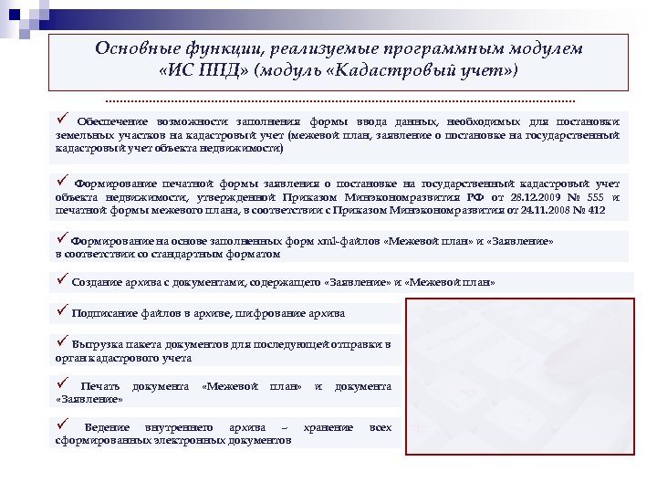 Основные функции, реализуемые программным модулем «ИС ППД» (модуль «Кадастровый учет» ) ü Обеспечение возможности заполнения формы ввода данных, необходимых для постановки земельных участков на кадастровый учет (межевой план, заявление о постановке на государственный кадастровый учет объекта недвижимости) ü Формирование печатной формы заявления о постановке на государственный кадастровый учет объекта недвижимости, утвержденной Приказом Минэкономразвития РФ от 28. 12. 2009 № 555 и печатной формы межевого плана, в соответствии с Приказом Минэкономразвития от 24. 11. 2008 № 412 ü Формирование на основе заполненных форм xml-файлов «Межевой план» и «Заявление» в соответствии со стандартным форматом ü Создание архива с документами, содержащего «Заявление» и «Межевой план» ü Подписание файлов в архиве, шифрование архива ü Выгрузка пакета документов для последующей отправки в орган кадастрового учета ü Печать документа «Заявление» ü «Межевой план» Ведение внутреннего архива – сформированных электронных документов и документа хранение всех
