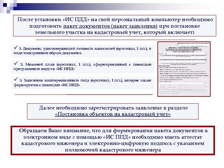 После установки «ИС ПДД» на свой персональный компьютер необходимо подготовить пакет документов (пакет заявления) при постановке земельного участка на кадастровый учет, который включает: ü 1. Документ, удостоверяющий личность заявителей (оригинал, 1 шт. ), в виде электронного образа документа ü 2. Межевой план (оригинал, 1 шт. ), сформированный с помощью программного модуля «ИС ППД» ü 3. Заявление заинтересованного лица (оригинал, 1 шт. ), которое также формируется с помощью «ИС ППД» Далее необходимо зарегистрировать заявление в разделе «Постановка объектов на кадастровый учет» Обращаем Ваше внимание, что для формирования пакета документов в электронном виде с помощью «ИС ППД» необходимо иметь аттестат кадастрового инженера и электронно-цифровую подпись с указанием полномочий кадастрового инженера