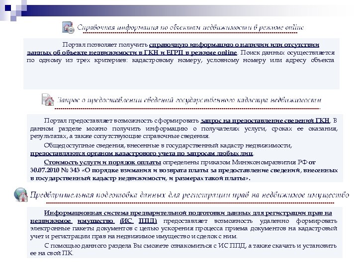 Портал позволяет получить справочную информацию о наличии или отсутствии данных об объекте недвижимости в ГКН и ЕГРП в режиме online. Поиск данных осуществляется по одному из трех критериев: кадастровому номеру, условному номеру или адресу объекта Портал предоставляет возможность сформировать запрос на предоставление сведений ГКН. В данном разделе можно получить информацию о получателях услуги, сроках ее оказания, результатах, а также сопутствующие справочные сведения. Общедоступные сведения, внесенные в государственный кадастр недвижимости, предоставляются органом кадастрового учета по запросам любых лиц. Стоимость услуги и порядок оплаты определены приказом Минэкономразвития РФ от 30. 07. 2010 № 343 «О порядке взимания и возврата платы за предоставление сведений, внесенных в государственный кадастр недвижимости, и размерах такой платы» . Информационная система предварительной подготовки данных для регистрации прав на недвижимое имущество (ИС ППД) предоставляет возможность удаленно формировать электронные пакеты документов с целью ускорения процесса приема документов на кадастровый учет и регистрации прав на недвижимое имущество и сделок с ним. С помощью данного раздела Вы сможете ознакомиться с ИС ППД, а также скачать и установить ее на свой ПК.