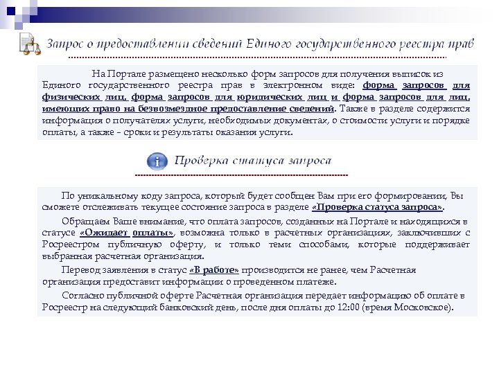 На Портале размещено несколько форм запросов для получения выписок из Единого государственного реестра прав в электронном виде: форма запросов для физических лиц, форма запросов для юридических лиц и форма запросов для лиц, имеющих право на безвозмездное предоставление сведений. Также в разделе содержится информация о получателях услуги, необходимых документах, о стоимости услуги и порядке оплаты, а также – сроки и результаты оказания услуги. По уникальному коду запроса, который будет сообщен Вам при его формировании, Вы сможете отслеживать текущее состояние запроса в разделе «Проверка статуса запроса» . Обращаем Ваше внимание, что оплата запросов, созданных на Портале и находящихся в статусе «Ожидает оплаты» , возможна только в расчетных организациях, заключивших с Росреестром публичную оферту, и только теми способами, которые поддерживает выбранная расчетная организация. Перевод заявления в статус «В работе» производится не ранее, чем Расчетная организация предоставит информации о проведенном платеже. Согласно публичной оферте Расчетная организация передает информацию об оплате в Росреестр на следующий банковский день, после дня оплаты до 12: 00 (время Московское).