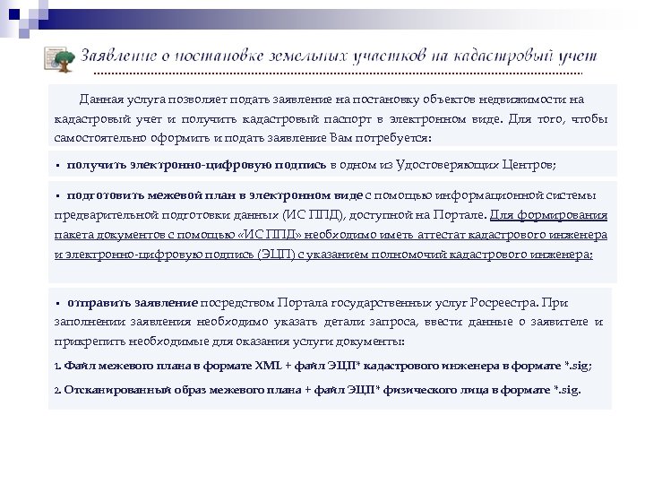 Данная услуга позволяет подать заявление на постановку объектов недвижимости на кадастровый учет и получить кадастровый паспорт в электронном виде. Для того, чтобы самостоятельно оформить и подать заявление Вам потребуется: • получить электронно-цифровую подпись в одном из Удостоверяющих Центров; • подготовить межевой план в электронном виде с помощью информационной системы предварительной подготовки данных (ИС ППД), доступной на Портале. Для формирования пакета документов с помощью «ИС ППД» необходимо иметь аттестат кадастрового инженера и электронно-цифровую подпись (ЭЦП) с указанием полномочий кадастрового инженера; • отправить заявление посредством Портала государственных услуг Росреестра. При заполнении заявления необходимо указать детали запроса, ввести данные о заявителе и прикрепить необходимые для оказания услуги документы: 1. Файл межевого плана в формате XML + файл ЭЦП* кадастрового инженера в формате *. sig; 2. Отсканированный образ межевого плана + файл ЭЦП* физического лица в формате *. sig.