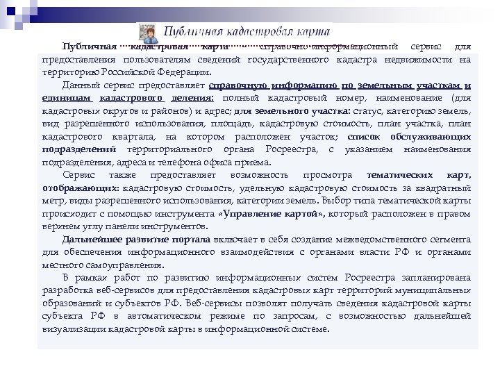 Публичная кадастровая карта – справочно-информационный сервис для предоставления пользователям сведений государственного кадастра недвижимости на территорию Российской Федерации. Данный сервис предоставляет справочную информацию по земельным участкам и единицам кадастрового деления: полный кадастровый номер, наименование (для кадастровых округов и районов) и адрес; для земельного участка: статус, категорию земель, вид разрешенного использования, площадь, кадастровую стоимость, план участка, план кадастрового квартала, на котором расположен участок; список обслуживающих подразделений территориального органа Росреестра, с указанием наименования подразделения, адреса и телефона офиса приема. Сервис также предоставляет возможность просмотра тематических карт, отображающих: кадастровую стоимость, удельную кадастровую стоимость за квадратный метр, виды разрешенного использования, категории земель. Выбор типа тематической карты происходит с помощью инструмента «Управление картой» , который расположен в правом верхнем углу панели инструментов. Дальнейшее развитие портала включает в себя создание межведомственного сегмента для обеспечения информационного взаимодействия с органами власти РФ и органами местного самоуправления. В рамках работ по развитию информационных систем Росреестра запланирована разработка веб-сервисов для предоставления кадастровых карт территорий муниципальных образований и субъектов РФ. Веб-сервисы позволят получать сведения кадастровой карты субъекта РФ в автоматическом режиме по запросам, с возможностью дальнейшей визуализации кадастровой карты в информационной системе.