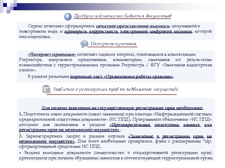 Сервис позволяет сформировать печатное представление выписки, полученной в электронном виде, и проверить корректность электронной цифровой подписи, которой она подписана. «Интернет-приемная» позволяет задавать вопросы, относящиеся к компетенции Росреестра, направлять предложения, комментарии, замечания по результатам взаимодействия с территориальными органами Росреестра / ФГУ «Земельная кадастровая палата» . В разделе размещен опросный лист «Организация работы граждан» . Для подачи заявления на государственную регистрацию прав необходимо: 1. Подготовить пакет документов (пакет заявления) при помощи «Информационной системы предварительной подготовки документов» (ИС ППД). Программное обеспечение «ИС ППД» доступно для скачивания в разделе «Предварительная подготовка данных для регистрации прав на недвижимое имущество» . 2. Зарегистрировать запрос в разделе портала «Заявление о регистрации прав на недвижимое имущество» . Для этого необходимо прикрепить файл с расширением *zip, сформированный средствами ИС ППД. • Выдача выходных документов (свидетельство о государственной регистрации прав) производится при личном обращении заявителя в соответствующий территориальный орган.
