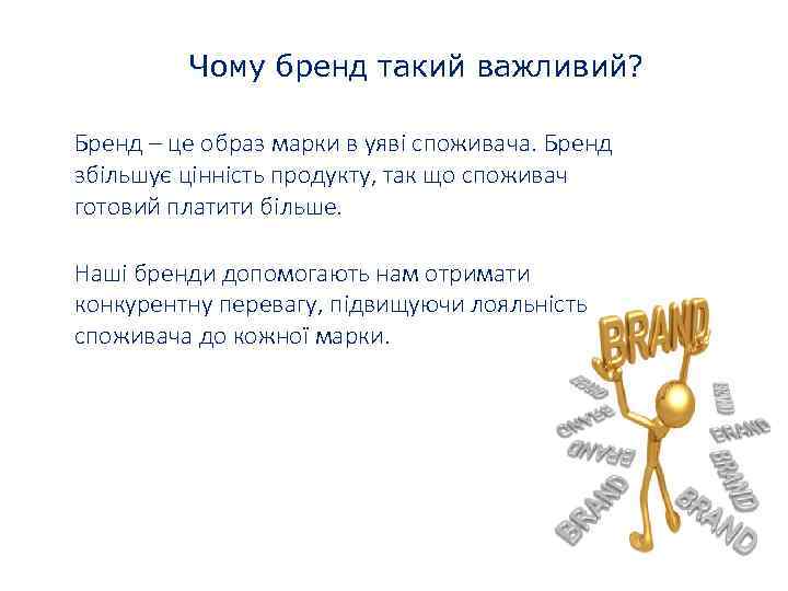 Чому бренд такий важливий? Бренд – це образ марки в уяві споживача. Бренд збільшує цінність продукту, так що споживач готовий платити більше. Наші бренди допомогають нам отримати конкурентну перевагу, підвищуючи лояльність споживача до кожної марки.