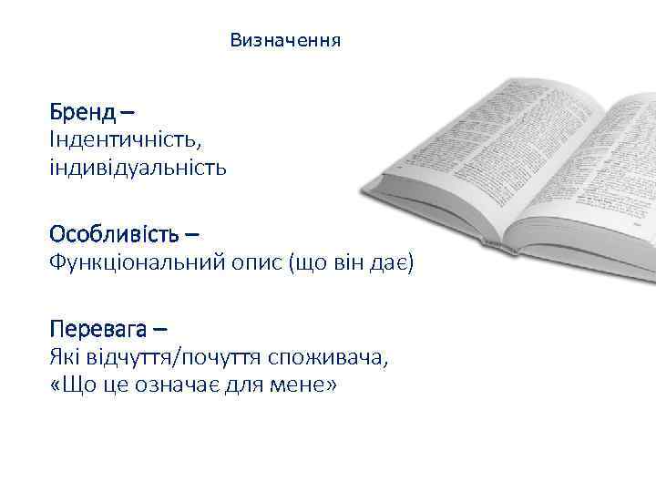 Визначення Бренд – Індентичність, індивідуальність Особливість – Функціональний опис (що він дає) Перевага – Які відчуття/почуття споживача, «Що це означає для мене»