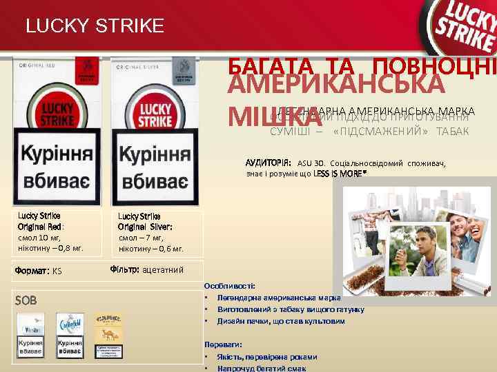 LUCKY STRIKE БАГАТА ТА ПОВНОЦНІ АМЕРИКАНСЬКА ЛЕГЕНДАРНА АМЕРИКАНСЬКА МАРКА ОСОБЛИВИЙ ПІДХІД ДО ПРИГОТУВАННЯ МІШКА «ПІДСМАЖЕНИЙ» ТАБАК СУМІШІ – АУДИТОРІЯ: ASU 30. Соціальносвідомий споживач, знає і розуміє що LESS IS MORE* Lucky Strike Original Red: смол 10 мг, нікотину – 0, 8 мг. Формат: KS Lucky Strike Original Silver: смол – 7 мг, нікотину – 0, 6 мг. Фільтр: ацетатний Особливості: SOB • • • Легендарна американська марка Виготовлений з табаку вищого гатунку Дизайн пачки, що став культовим Переваги: • • Якість, перевірена роками Напрочуд багатий смак