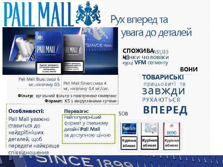 Рух вперед та увага до деталей СПОЖИВАASU 35 жінки чоловіки ЧІ курці VFM сегменту ТОВАРИСЬКІ Pall Mall Blue: смол 6 мг, нікотину 0, 5 Pall Mall Silver: смол 4 мг, нікотину 0, 4 мг/сиг. працьовиті та завжди Фільтр: вугільний фільтр з повітряною камерою Формат: KS з закругленими кутами Особливості: Pall Mall уважно ставиться до найдрібніших деталей, щоб передати найкраще співвідношення ціни та якості. Переваги: Найпопулярніший формат у стильному дизайні Pall Mall за доступною ціною ВОНИ РУХАЮТЬСЯ SOB ВПЕРЕД