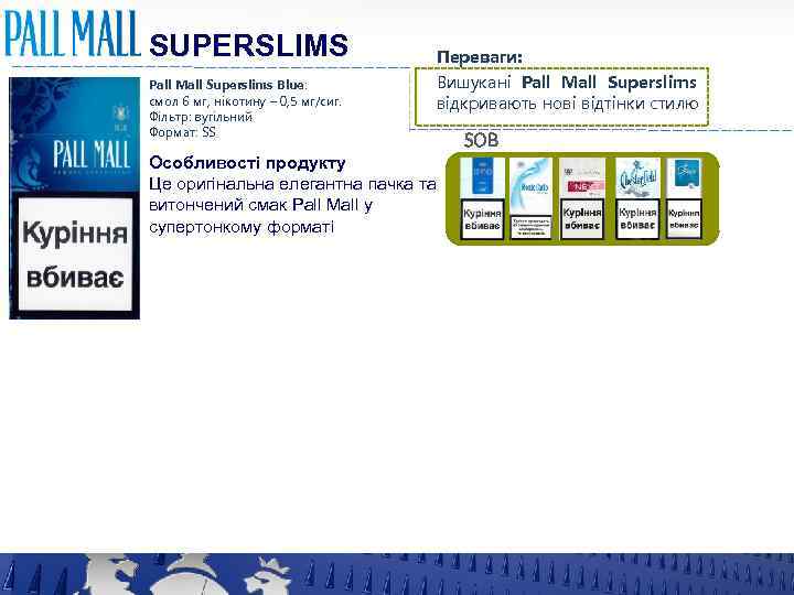 SUPERSLIMS Pall Mall Superslims Blue: смол 6 мг, нікотину – 0, 5 мг/сиг. Фільтр: вугільний Формат: SS Переваги: Вишукані Pall Mall Superslims відкривають нові відтінки стилю Особливості продукту Це оригінальна елегантна пачка та витончений смак Pall Mall у супертонкому форматі SOB
