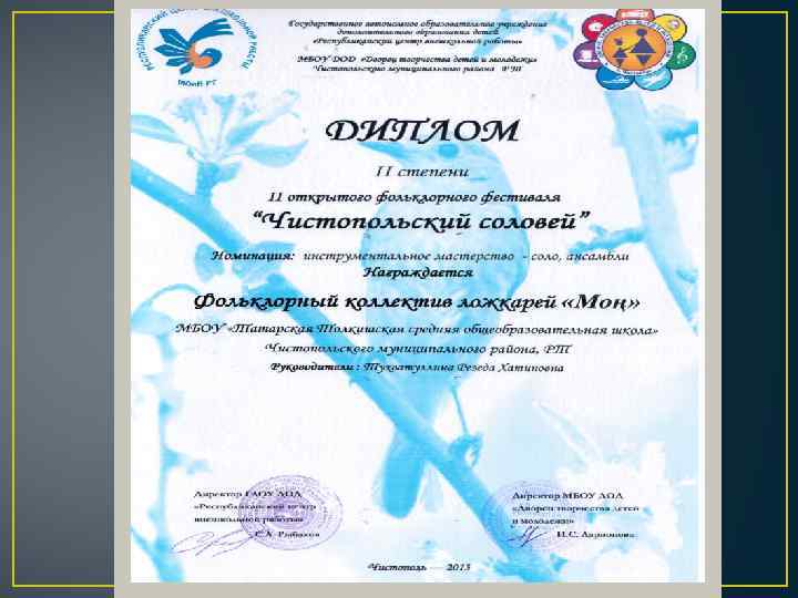 Муниципальный смотрконкурс “Музыкальный ларец”, Чистополь-2009 г. Диплом II место.