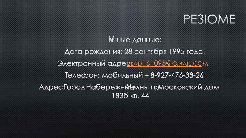 РЕЗЮМЕ ЛИЧНЫЕ ДАННЫЕ: ДАТА РОЖДЕНИЯ: 28 СЕНТЯБРЯ 1995 ГОДА. ЭЛЕКТРОННЫЙ АДРЕС: VLAD 161095@GMAIL. COM ТЕЛЕФОН: МОБИЛЬНЫЙ – 8 -927 -476 -38 -26 АДРЕС: ГОРОД НАБЕРЕЖНЫЕ ЧЕЛНЫ ПР. МОСКОВСКИЙ ДОМ 183 Б КВ. 44