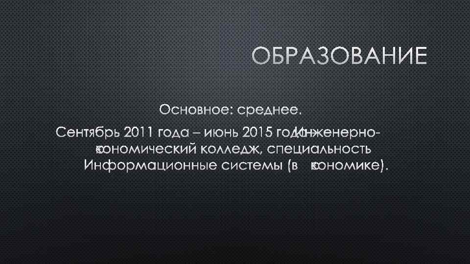 ОБРАЗОВАНИЕ ОСНОВНОЕ: СРЕДНЕЕ. СЕНТЯБРЬ 2011 ГОДА – ИЮНЬ 2015 ГОДА – ИНЖЕНЕРНОЭКОНОМИЧЕСКИЙ КОЛЛЕДЖ, СПЕЦИАЛЬНОСТЬ ИНФОРМАЦИОННЫЕ СИСТЕМЫ (В ЭКОНОМИКЕ).
