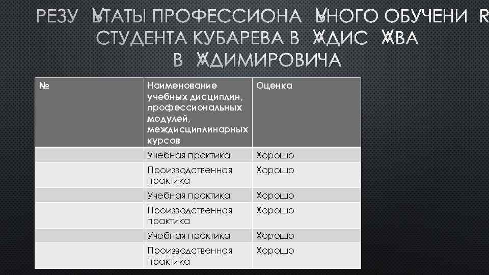 РЕЗУЛЬТАТЫ ПРОФЕССИОНАЛЬНОГО ОБУЧЕНИЯ СТУДЕНТА КУБАРЕВА ВЛАДИСЛАВА ВЛАДИМИРОВИЧА № Наименование Оценка учебных дисциплин, профессиональных модулей, междисциплинарных курсов Учебная практика Хорошо Производственная практика Хорошо