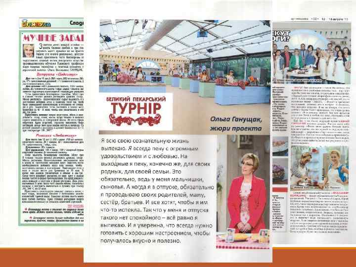 Інші публікації: Всеукраїнські видання журналів: • у 2013 р. у каталозі рецептів: № 7(77) надрукований майстер-клас з приготування «Літнього рогалика» • у журналі «Солодке життя» № 10(79) рецептури борошняних кондитерських виробів під назвою «Мучні забави» .