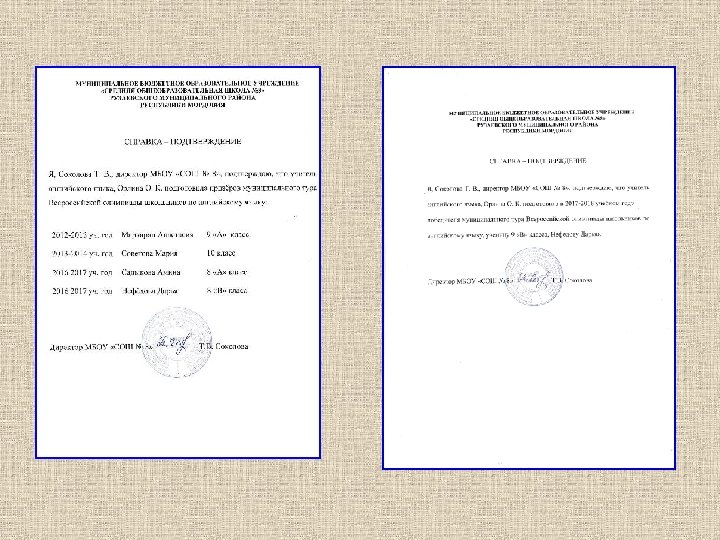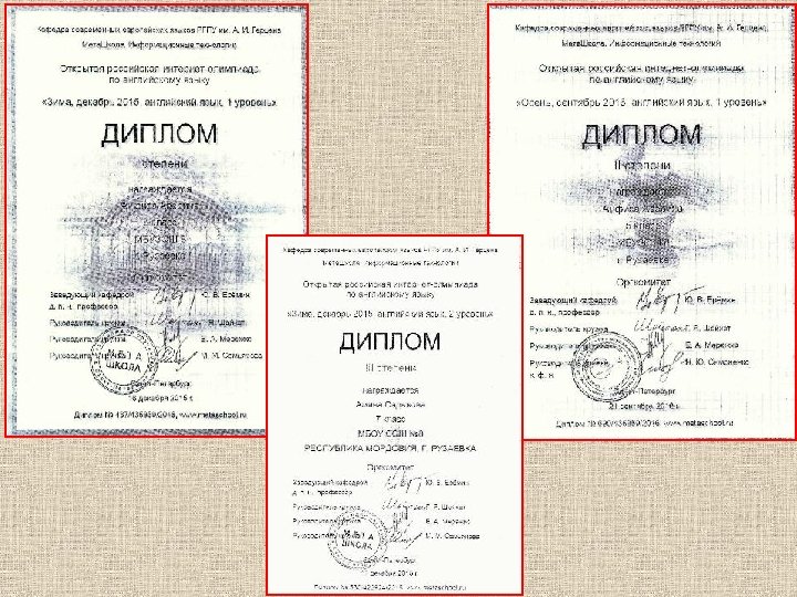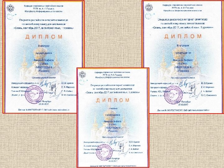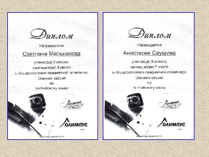 Наименование Уровень Дата проведения ФИ обучающегося класс Результат участия Открытая российская интернет – олимпиада по английскому языку Всероссийский 2015 год Садыкова Амина 7 класс Диплом III степени Международная онлайн олимпиада «Фоксфорд» по английскому языку Международный 2016 год Баракина Анастасия 5 класс Победитель олимпиады за 5 класс Диплом III степени Международная онлайн олимпиада «Фоксфорд» по английскому языку Международный 2016 год Баракина Анастасия 5 класс Победитель олимпиады за 6 класс Диплом II степени Международная онлайн олимпиада «Фоксфорд» по английскому языку Международный 2016 год Астафьева Дарья 5 класс Победитель олимпиады за 5 класс Диплом III степени Международная онлайн олимпиада «Фоксфорд» по английскому языку Международный 2016 год Забродина Мария 6 класс Победитель олимпиады за 6 класс Диплом II степени Общероссийская предметная олимпиада по английскому языку «Олимпус» Всероссийский 2016 год Мельникова Светлана 5 класс 8 место Общероссийская предметная олимпиада по английскому языку «Олимпус» Всероссийский 2016 год Саушина Анастасия 5 класс 7 место Открытая Российская интернет-олимпиада по английскому языку для школьников Всероссийский 2017 год Аверина Анфиса 6 класс Диплом I степени Диплом III степени