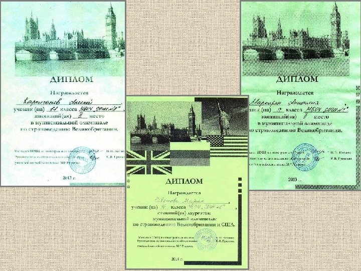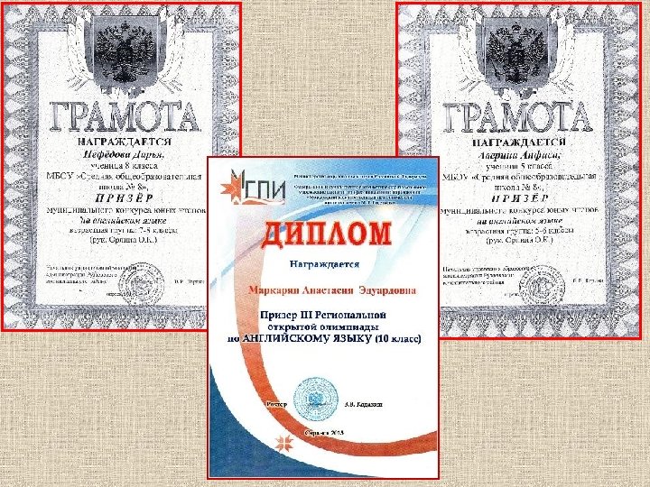 Наименование Уровень Дата проведения ФИ обучающегося класс Результат участия Олимпиада по страноведению. Великобритания Муниципальный 2013 год Карчеганов Алексей 11 класс 2 место Олимпиада по страноведению. Великобритания, США Муниципальный 2013 год Маркарян Анастасия 9 класс 2 место Олимпиада по страноведению. Великобритания, США Муниципальный 2014 год Советова Мария 10 класс Лауреат Олимпиада по страноведению. Великобритания, США Муниципальный 2017 год Нефёдова Дарья 9 класс Победитель Конкурс чтецов на английском языке Муниципальный 2014 год Советова Мария 10 класс Победитель Конкурс чтецов на английском языке Муниципальный 2016 год Нефёдова Дарья 7 класс Победитель в номинации «Актёрское мастерство» Конкурс чтецов на английском языке Муниципальный 2017 год Нефёдова Дарья 8 класс Призёр Конкурс чтецов на английском языке Муниципальный 2017 год Аверина Анфиса 5 класс Призёр III Региональная открытая олимпиада по английскому языку (МГПИ им Евсевьева) Республиканский 2015 год Маркарян Анастасия 10 класс Призёр Открытая российская интернет – олимпиада по английскому языку Всероссийский 2015 Аверина Анфиса 5 класс Диплом II степени Открытая российская интернет – олимпиада по английскому языку Всероссийский 2016 год Аверина Анфиса 5 класс Диплом II степени