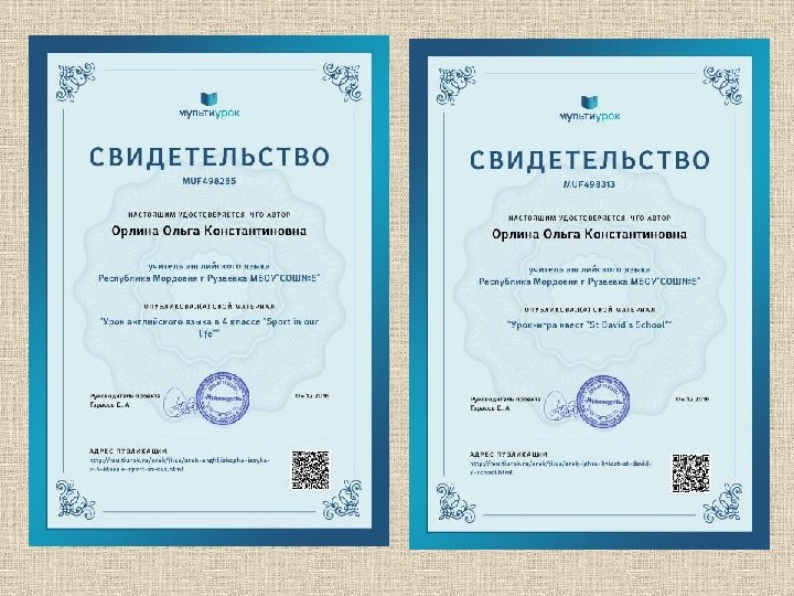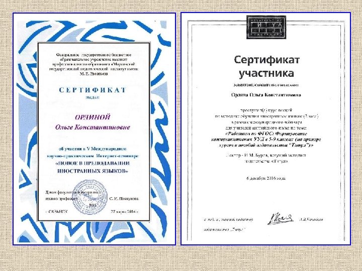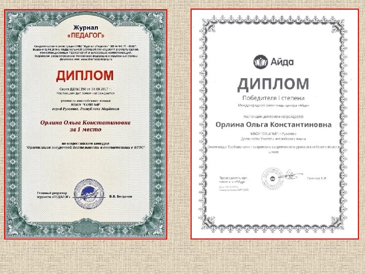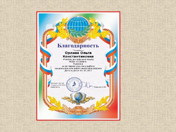 Портфолио Орлиной Ольги Константиновны, учителя МБОУ «СОШ № 8 » г. Рузаевки Дата рождения: 02. 1968. Профессиональное образование: учитель английского и немецкого языка, МГПИ им. Евсевьева № диплома 1002, дата выдачи 8 июля 1991 год Стаж педагогической работы (по специальности): 26 лет Наличие квалификационной категории: высшая Дата последней аттестации: 2013 год, приказ МО РМ от 26. 04. 13 № 396
