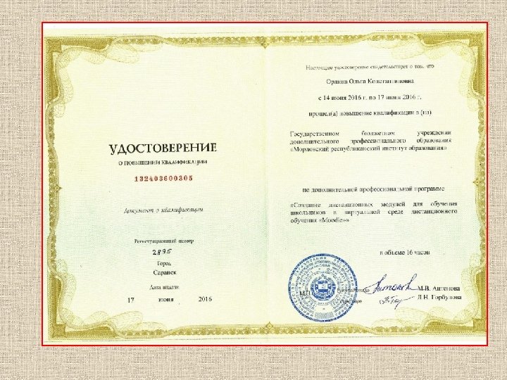 15. Повышение квалификации v «Научно-педагогическая коммуникация на английском языке» . В объеме 108 ч. , 2017 г. v «Создание дистанционных модулей для обучения школьников в виртуальной среде дистанционного обучения “Moodle” в объеме 16 ч. , 2016 г.