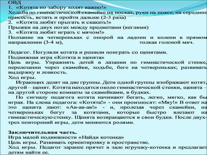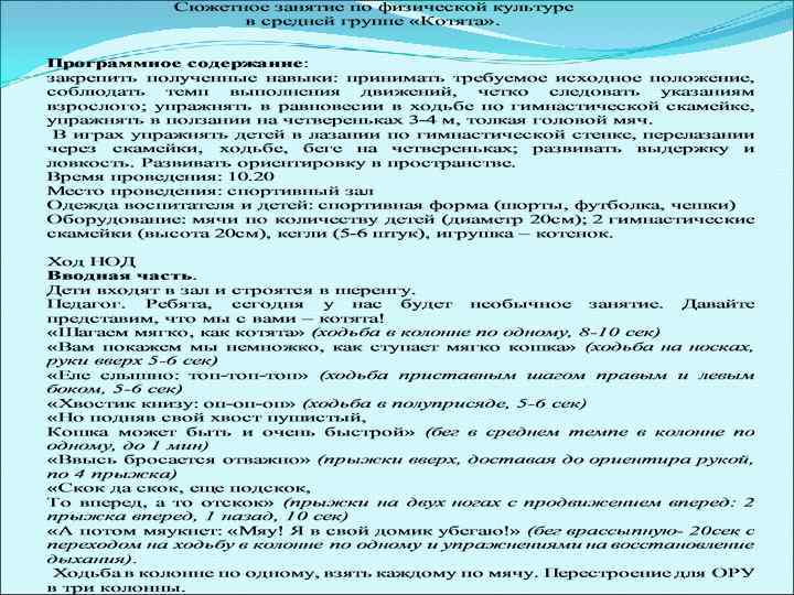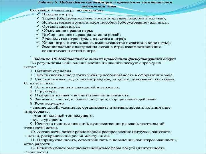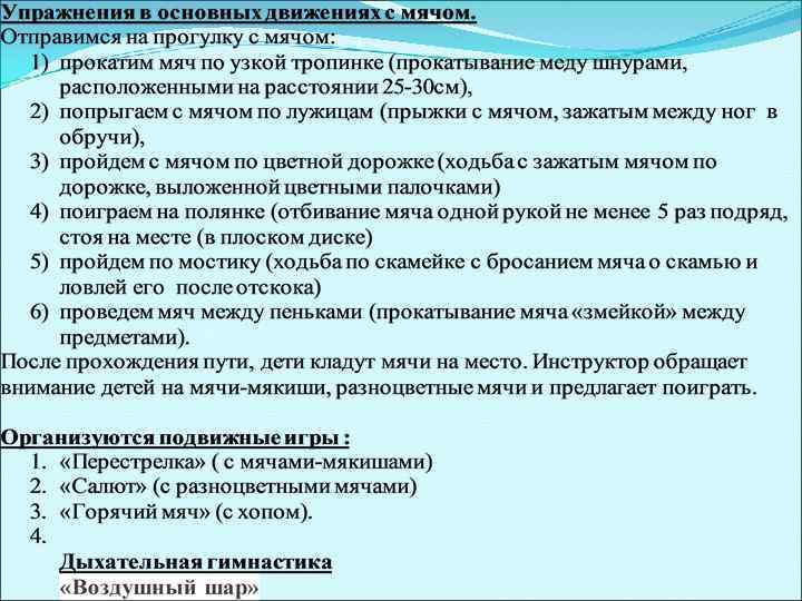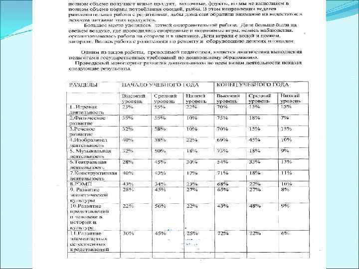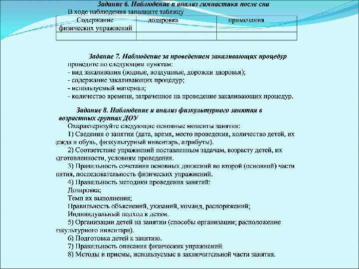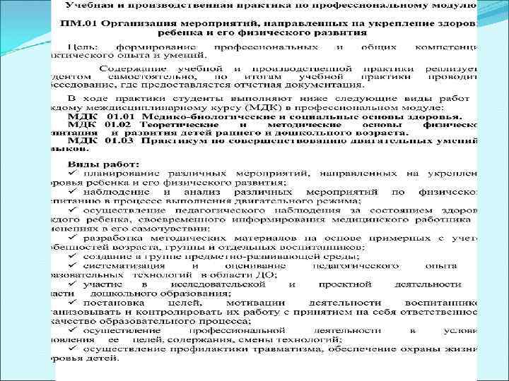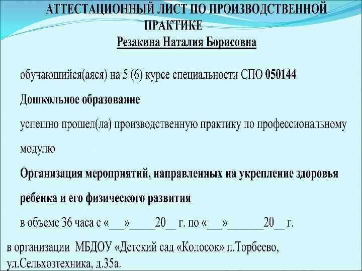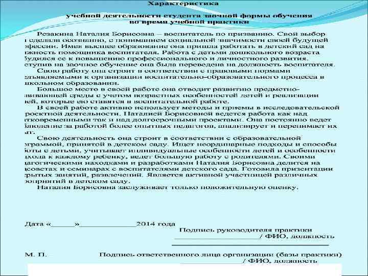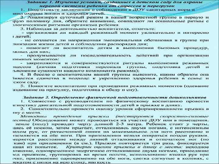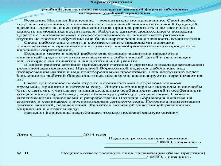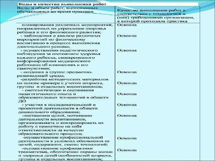 Виды и качество выполнения работ Виды и объем работ, выполненных обучающимся во время практики -планирование различных мероприятий, направленных на укрепление здоровья ребенка и его физического развития -наблюдения и анализа различных мероприятий по физическому воспитанию в процессе выполнения двигательного режима; -осуществления педагогического наблюдения за состоянием здоровья каждого ребенка, своевременного информирования медицинского работника об изменениях в его самочувствии -разработки методических материалов на основе примерных с учетом особенностей возраста, группы и отдельных воспитанников -создания в группе предметно развивающей среды. -систематизации и оценивания педагогического опыта и образовательных технологий в области ДО. Дата « __ » _______ Качество выполнения работ в соответствии с технологией и (или) требованиями организации, в которой проходила практика Освоила Освоила 20 _ г. Подписи: Руководитель практики: Ответственное лицо ДОУ: ______________ / _______