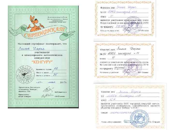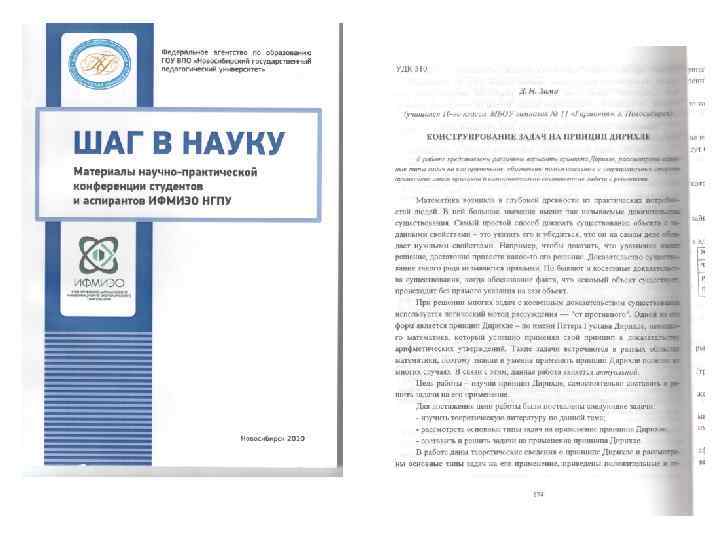 • Я делала научноисследовательскую работу по математике на тему «Конструирование задач на принцип Дирихле» , и у меня есть публикация этой работы в сборнике НГПУ ИМФМИЭО «Шаг в науку» .