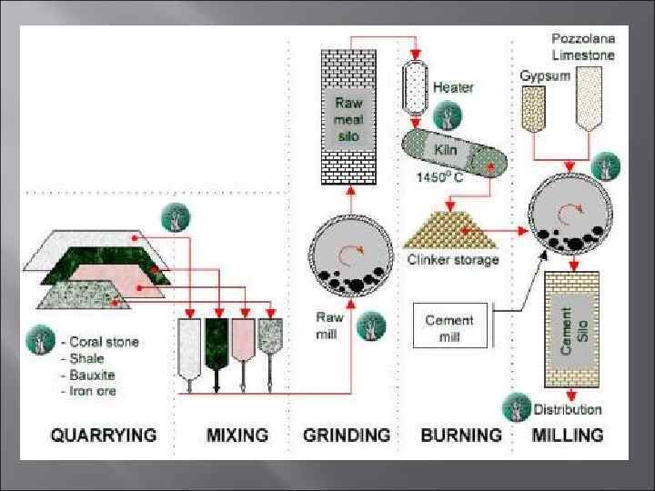 Процесс производства портланд -цемента: Добыча известняка и глины Приготовление сырьевой смеси (дробление, помол, корректировка состава сырья) Обжиг Помол клинкера совместно с гипсом Магазинирование