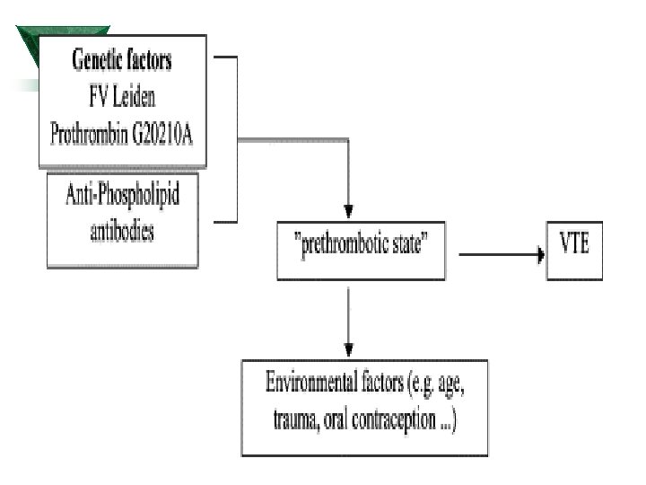 Defekty zodpovědné za vrozené hyperkoagulační stavy Ú Rezistence na aktivovaný protein C (Faktor V Leiden) Ú Deficit proteinu S Ú Deficit proteinu C Ú Deficit antitrombinu III Ú Hyperhomocysteinémie Ú Alela 20210 A v 3´oblasti genu protrombin Ú Dysplasminogenemie Ú Vysoké hladiny PAI Ú Dysfibrinogenémie Ú Zvýšený faktor VIII
