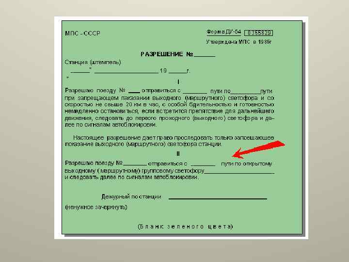 4 Для отправления в исключительных случаях поездов с путей, не имеющих выходных светофоров; Для отправления со станции поездов в тех случаях, когда голова поезда находится за выходным светофором " Машинист поезда N … на …. . пути. Выходной светофор Вам открыт. Разрешаю отправиться. ДСП…. ". по разрешению на бланке зеленого цвета формы ДУ-54 с заполнением пункта II, вручаемому машинисту
