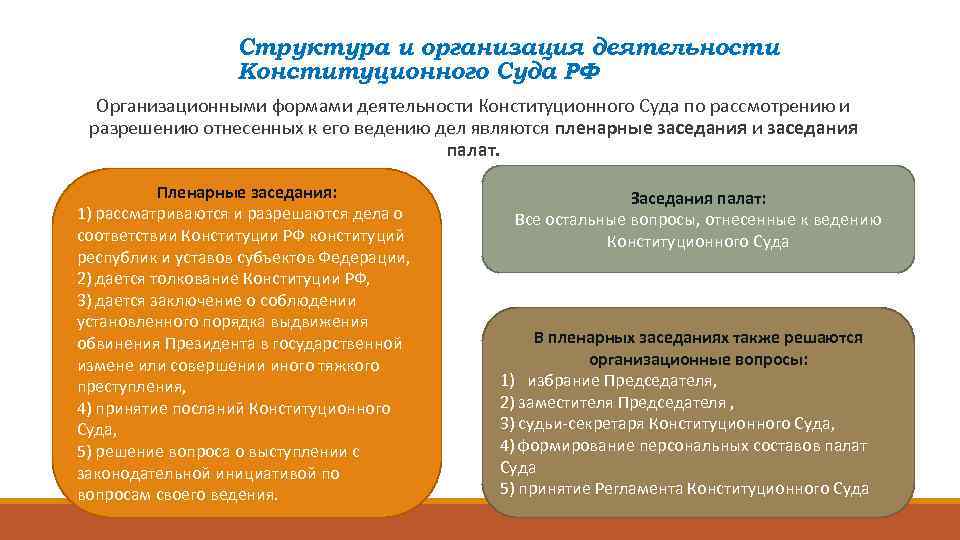 Структура и организация деятельности Конституционного Суда РФ Организационными формами деятельности Конституционного Суда по рассмотрению и разрешению отнесенных к его ведению дел являются пленарные заседания и заседания палат. Пленарные заседания: 1) рассматриваются и разрешаются дела о соответствии Конституции РФ конституций республик и уставов субъектов Федерации, 2) дается толкование Конституции РФ, 3) дается заключение о соблюдении установленного порядка выдвижения обвинения Президента в государственной измене или совершении иного тяжкого преступления, 4) принятие посланий Конституционного Суда, 5) решение вопроса о выступлении с законодательной инициативой по вопросам своего ведения. Заседания палат: Все остальные вопросы, отнесенные к ведению Конституционного Суда В пленарных заседаниях также решаются организационные вопросы: 1) избрание Председателя, 2) заместителя Председателя , 3) судьи-секретаря Конституционного Суда, 4) формирование персональных составов палат Суда 5) принятие Регламента Конституционного Суда