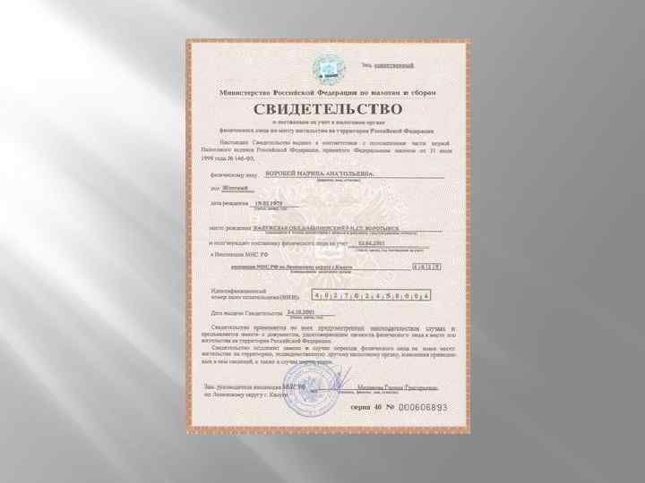 1. Форма № 09 -2 -1 – «Заявление физического лица о выдаче документа, подтверждающего присвоение идентификационного номера налогоплательщика» 2. Форма № 09 -2 -2 – «Свидетельство о постановке на учет в налоговом органе физического лица по месту жительства на территории РФ» 3. Форма № 09 -2 -3 – «Уведомление о постановке на учет в налоговом органе физического лица по месту жительства»