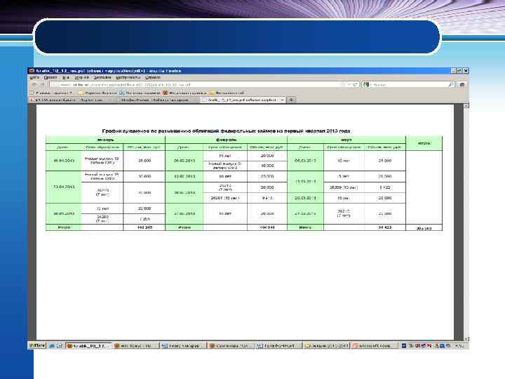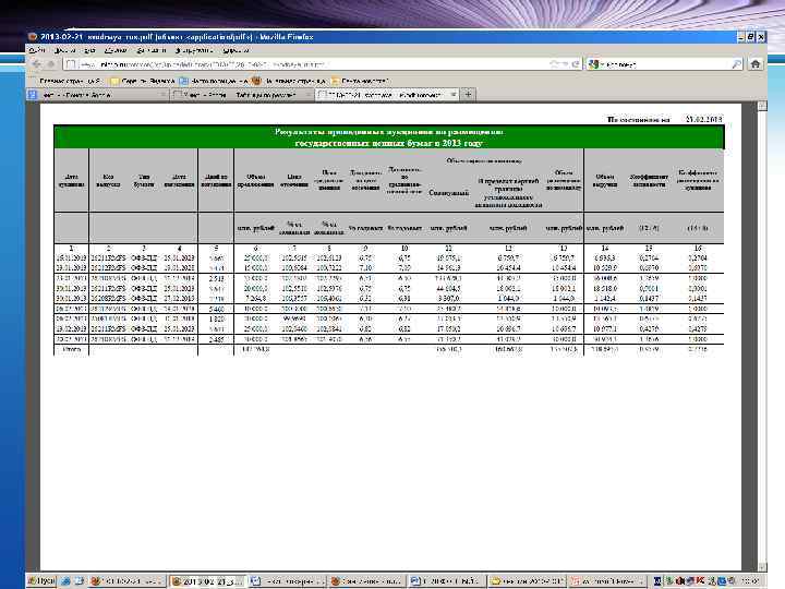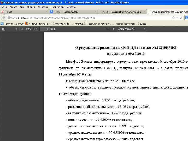 v О результатах размещения ОФЗ-ПД выпуска № 25081 RMFS v на аукционе 27. 02. 2013 v Минфин России информирует о результатах проведения 27 февраля 2013 года аукциона по размещению ОФЗ-ПД выпуска № 25081 RMFS с датой погашения 31 января 2018 года. v Итоги размещения выпуска № 25081 RMFS: v - объем спроса по верхней границе установленного диапазона доходности – 12, 235 млрд. рублей; v - объем предложения – 26, 449 млрд. рублей; v - размещенный объем выпуска – 12, 235 млрд. рублей; v - выручка от размещения – 12, 329 млрд. рублей; v - цена отсечения – 100, 3716% от номинала; v - доходность по цене отсечения – 6, 20% годовых; v - средневзвешенная цена – 100, 4089% от номинала; v - средневзвешенная доходность – 6, 20% годовых.