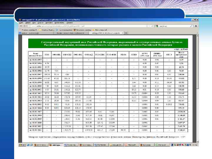 Объем государственного внутреннего долга Российской Федерации, млрд. руб. По состоянию на всего в т. ч. государственные гарантии Российской Федерации в валюте Росийской Федерации 01. 1993 3, 57 0, 08 01. 1994 15, 64 0, 33 01. 1995 88, 06 2, 14 01. 1996 187, 74 7, 46 01. 1997 364, 46 17, 24 01. 1998 490, 92 3, 47 01. 1999 529, 94 0, 88 01. 2000 578, 23 0, 82 01. 2001 557, 42 1, 02 01. 2002 533, 51 0, 02 01. 2003 679, 91 8, 62 01. 2004 682, 02 5, 58 01. 2005 778, 47 12, 93 01. 2006 875, 43 18, 86 01. 2007 1064, 88 31, 23 01. 2008 1301, 15 46, 68 01. 2009 1499, 82 72, 49 01. 2010 2094, 73 251, 36 01. 2011 2940, 39 472, 25 01. 2012 01. 2013 4190, 55 637, 33 4977, 90 906, 6