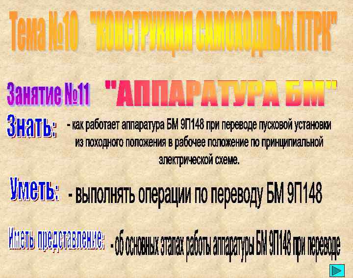 ПОРЯДОК ПЕРЕВОДА БМ 9 П 148 ИЗ ПОХОДНОГО ПОЛОЖЕНИЯ В РАБОЧЕЕ ПОЛОЖЕНИЕ: 1. Перевести боевую машину в режим поиска цели. После обнаружения цели выбрать тип ПТУР (9 М 113 или 9 М 111) для поражения данной цели. 2. Расстопорить погон и раму пусковой установки. 3. На пульте оператора переключатель «ПОЛОЖЕНИЕ» установить в соответствии с номером направляющей на которой закреплена выбранная для поражения данной цели ПТУР. Загорание сигнальных лампочек «РАБОЧЕЕ» на пульте оператора и лампочек « 0°ВН» ; « 0°ГН» ; «ЛЮК ЗАКР, » на блоке автоматики и управления свидетельствует о том, что ПУ заняла рабочее положение. .