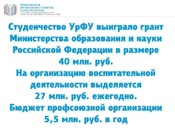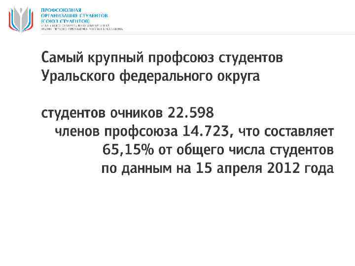 Сводная картина профсоюзного членства Профсоюзной организации Студентов (Союза Студентов) Ур. ФУ Всего студентов бюджет. платн. Вступило в ПОС Ур. ФУ ИТОГО бюджет. платн. ИТОГО % профсоюзного членства ПОС Ур. ФУ Итого в ИЕН: 1376 68 1444 1264 27 1291 89, 40% Итого на ФТИ: 1445 258 1703 1316 185 1501 88, 14% Итого на Ст. И: 809 581 1390 746 348 1094 78, 71% Итого на ХТИ: 625 22 647 495 12 507 78, 36% Итого в ИММт: 1766 254 2020 1392 109 1501 74, 31% Итого на ИВТОБ: 308 206 514 249 127 376 73, 15% Итого на 1374 300 1674 1049 81 1130 67, 50% Итого в НТИ: 794 317 1111 570 156 726 65, 35% Урал. ЭНИН